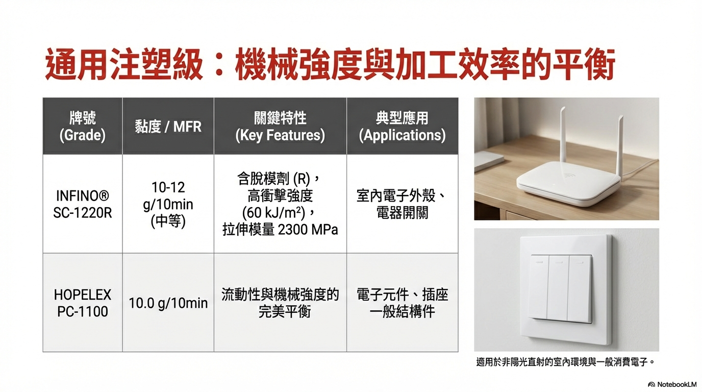 應用用途: 適用於室內使用的電子產品外殼、電器開關面板、轉接器外殼。由於未特別標註 UV 穩定,建議用於非陽光直射環境 。