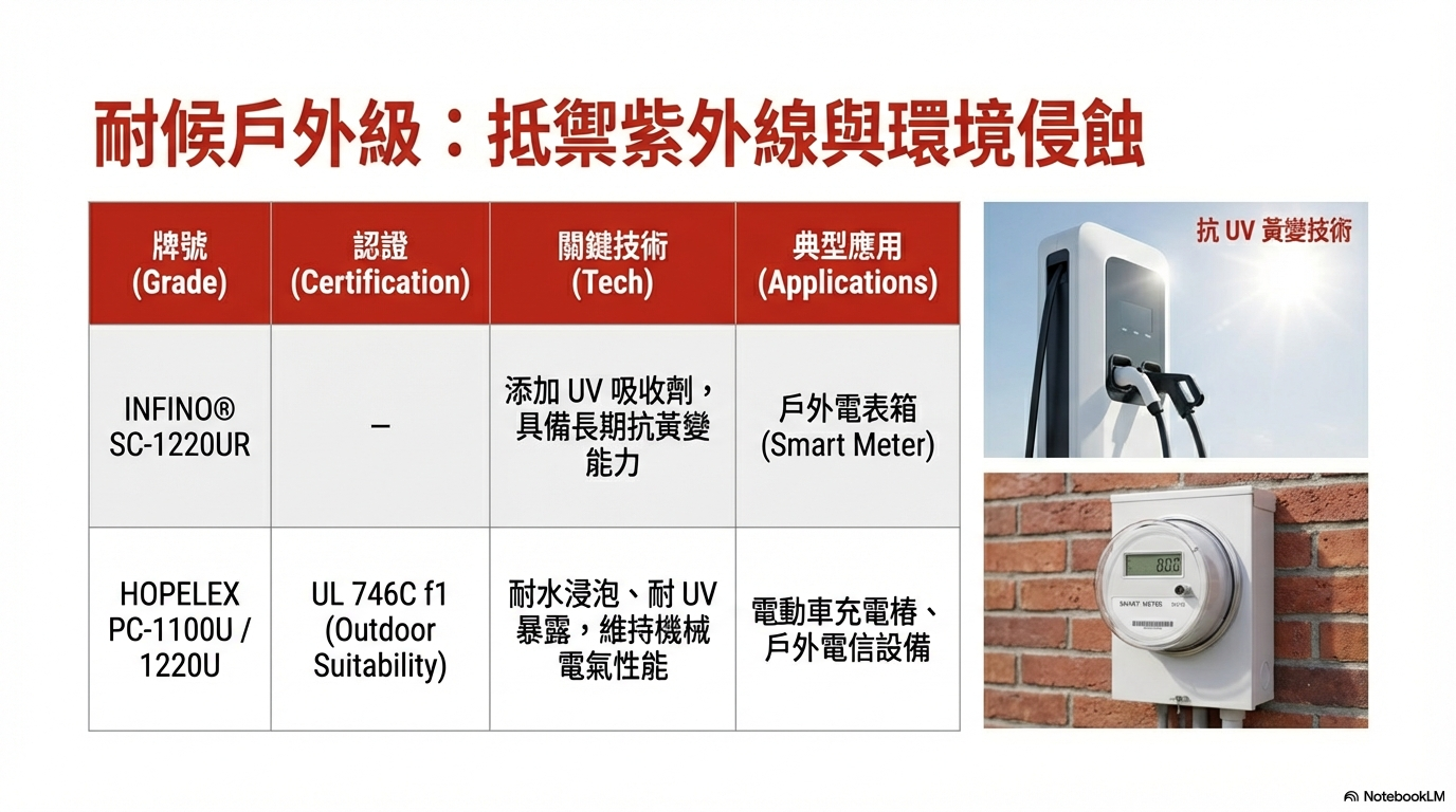 規格特性: 這些牌號通過了 UL 746C 的 f1 認證(Suitable for outdoor use),這意味著它們在經歷紫外線暴露與水浸泡測試後,仍能保持機械與電氣性能 。