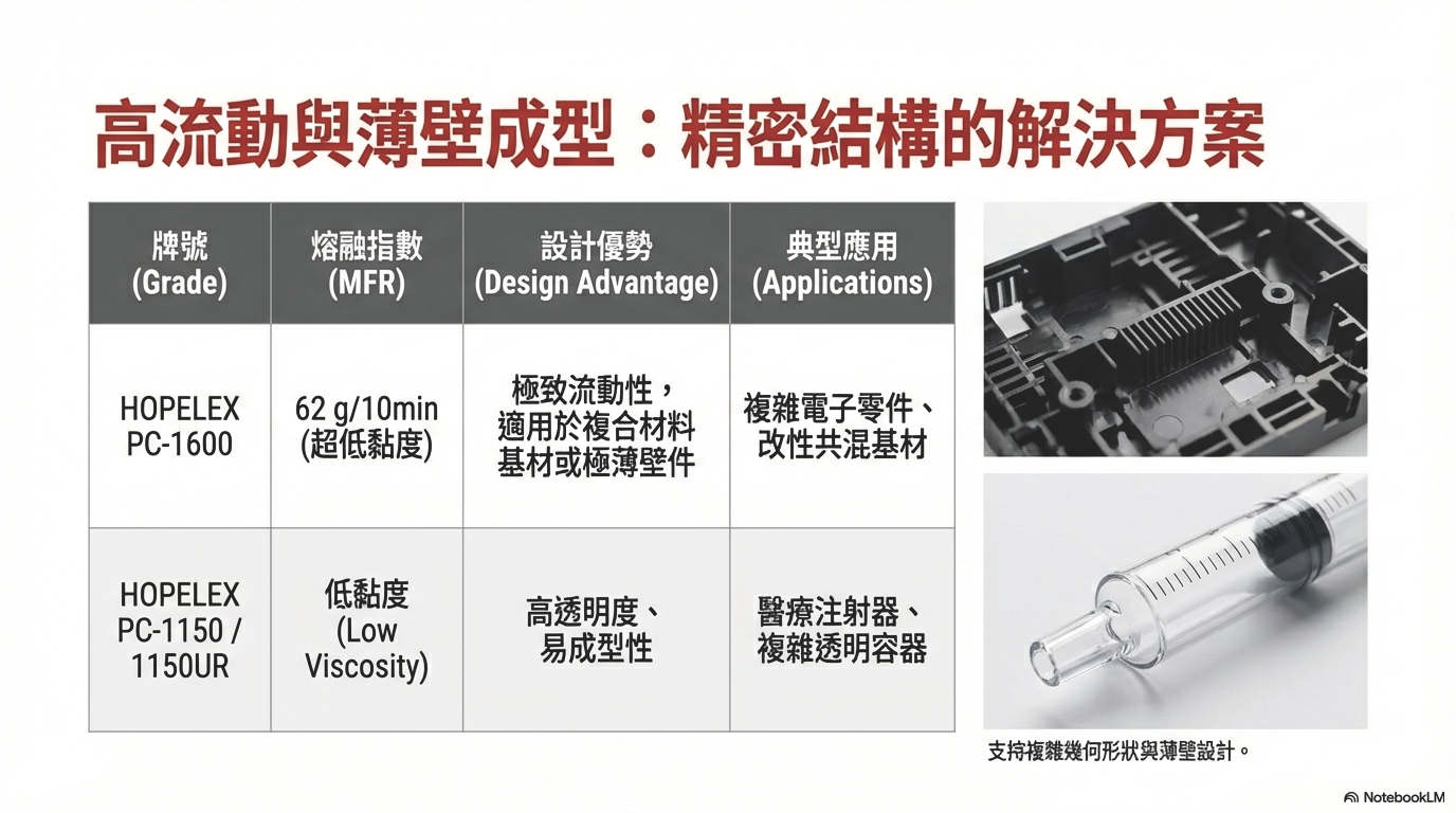 針對薄壁成型或大型複雜模具,需要極低的黏度以確保充模完整。