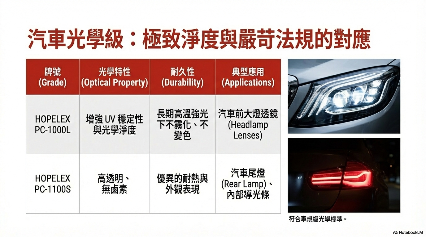 應用用途: 汽車前大燈透鏡(Headlamp Lenses)、信號燈罩。這類應用要求材料在長期高溫與強光照射下不發生霧化或變色,以確保配光性能符合法規。