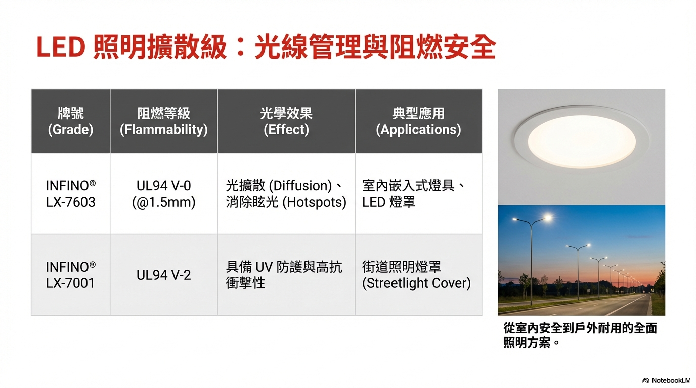 應用用途: LED 照明燈罩(Lighting Cover)、室內嵌入式燈具。V-0 阻燃等級對於建築內部的天花板照明是強制性的安全要求。